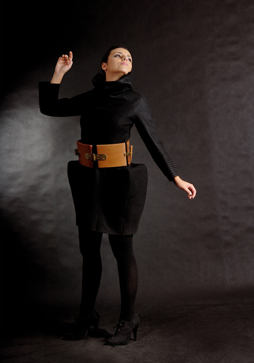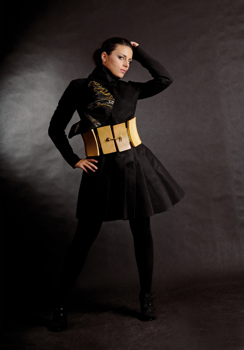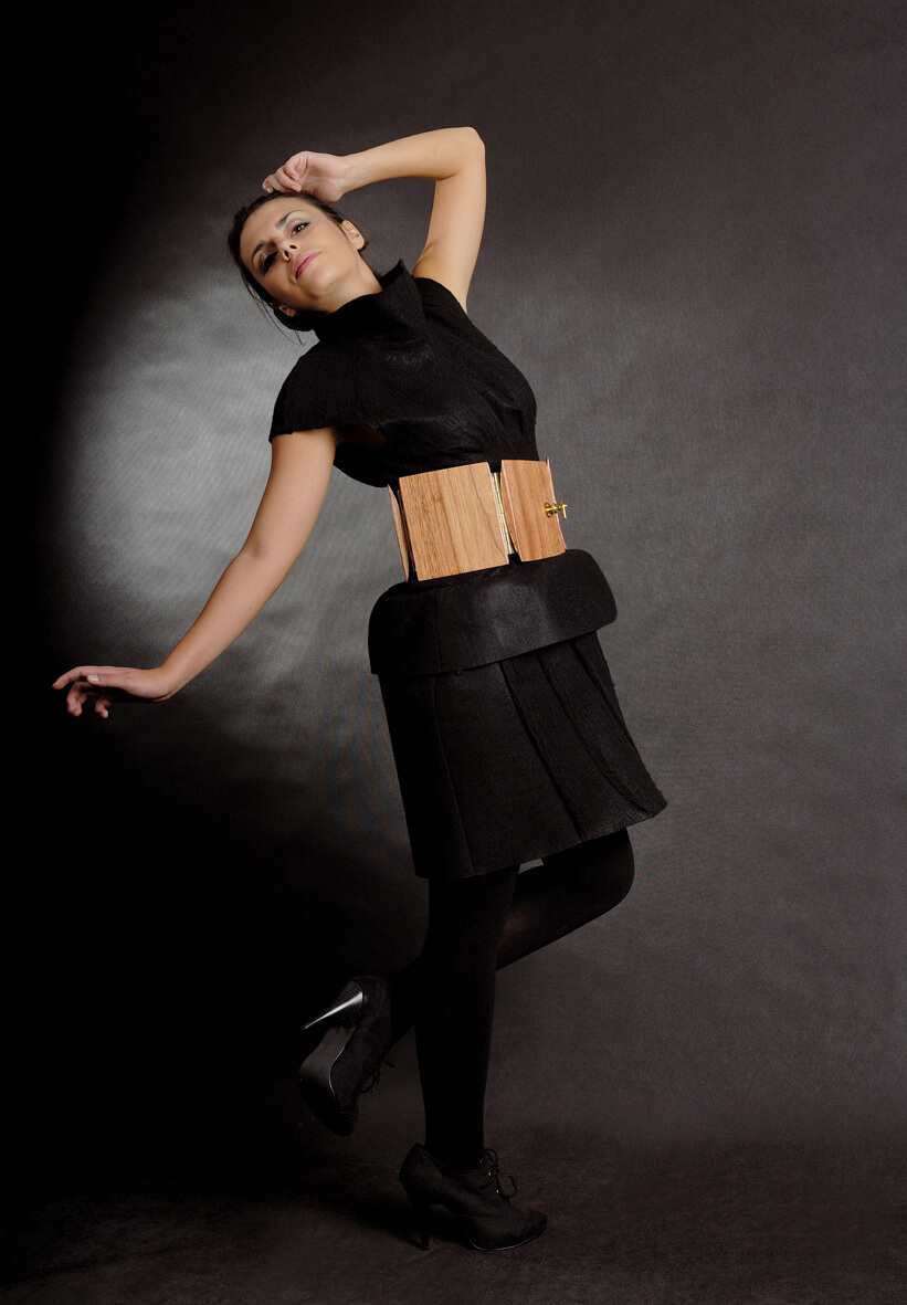 Diese einzigartige Mode-Kollektion vereinigt in sich Inspirationen durch verschiedene Materialien: Filz, Holz, und ein von der Künstlerin selbst geschaffenes Material aus Naturharz. Die Gürtel der Kollektion sind aus Mahagoni- und Kiefernholz gefertigt. Die Kreationen ergänzen Elemente aus Schrauben und Scharnieren, und als Verschlüsse dienen Haspen und Vorhängeschlösser. Jedes Kleidungsstück zeichnet sich durch eine Vielfalt gestalterischer Lösungen sowie hervorgehobene und auf innovative Art versteifte Formen aus.