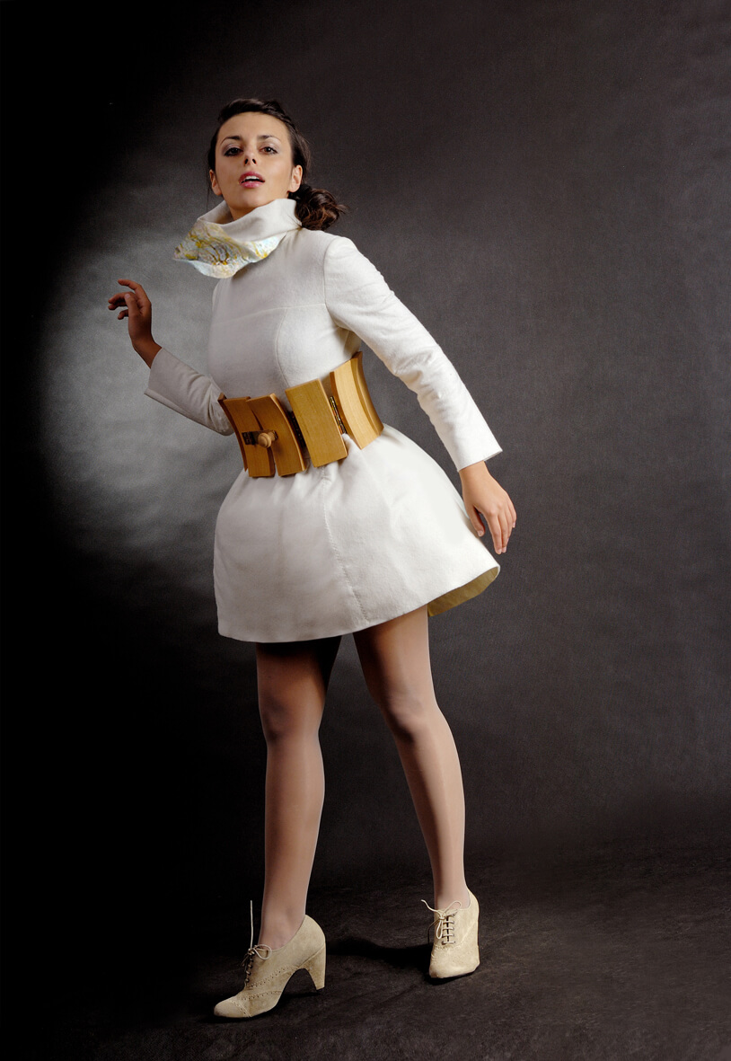 A collection of my fashion design is a combination of several inspirations: fleece, my own unique fabric with a hint of inspiration of wood and others. The unique fabric is my own experiment with resin. The belts I designed were made from mahogany and pine. Elements of the belts were joined with brass hinges and bolts. Buckles were made from staples and padlocks. The clothing as a whole is a variety of design ideas, highlighted and innovatively moulded forms and shapes.