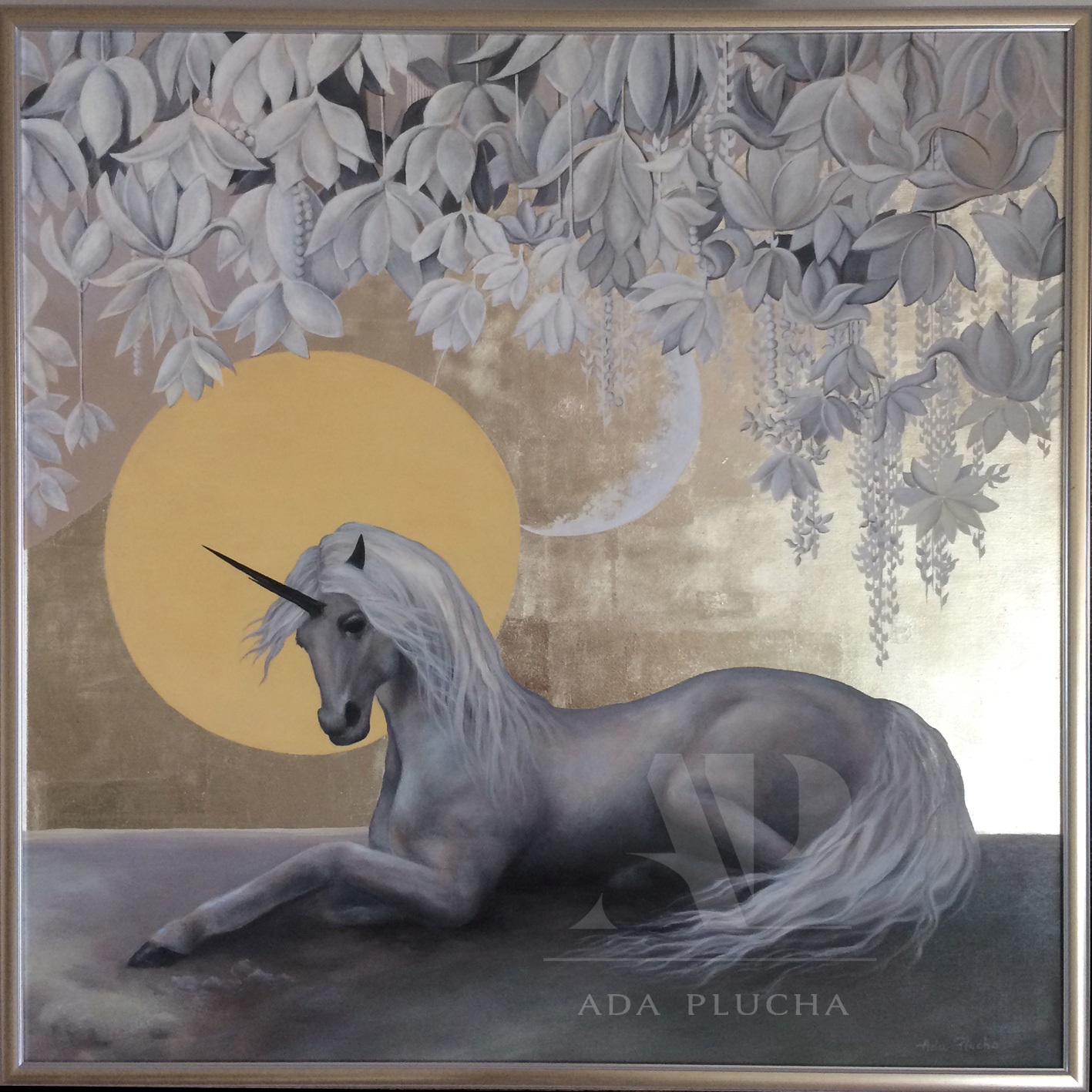 A painting on canvas, white gold in flakes, my own technique, 90 x 90 cm, 2017. The painting is framed.