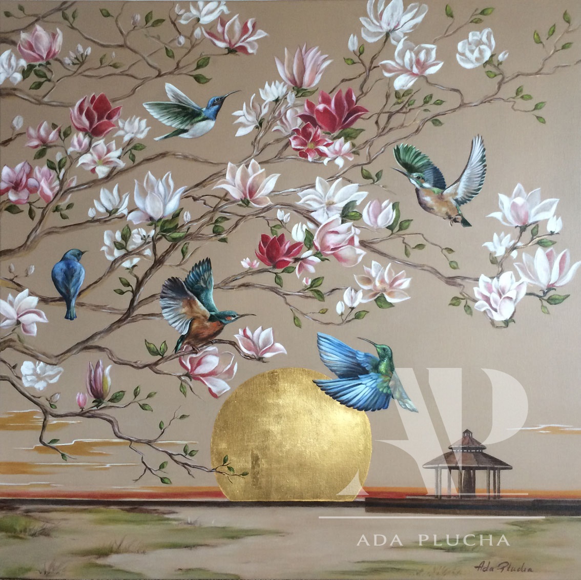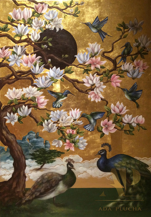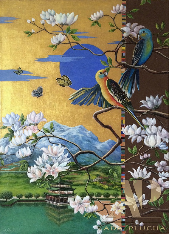 The collection „The Gardens of the World” in the glamour style consists of paintings created intricately by me, mainly in egg tempera technique. The technique in pigments derived from natural rocks is based on a hand-prepared egg binder and is considered to be one of the oldest painting techniques.