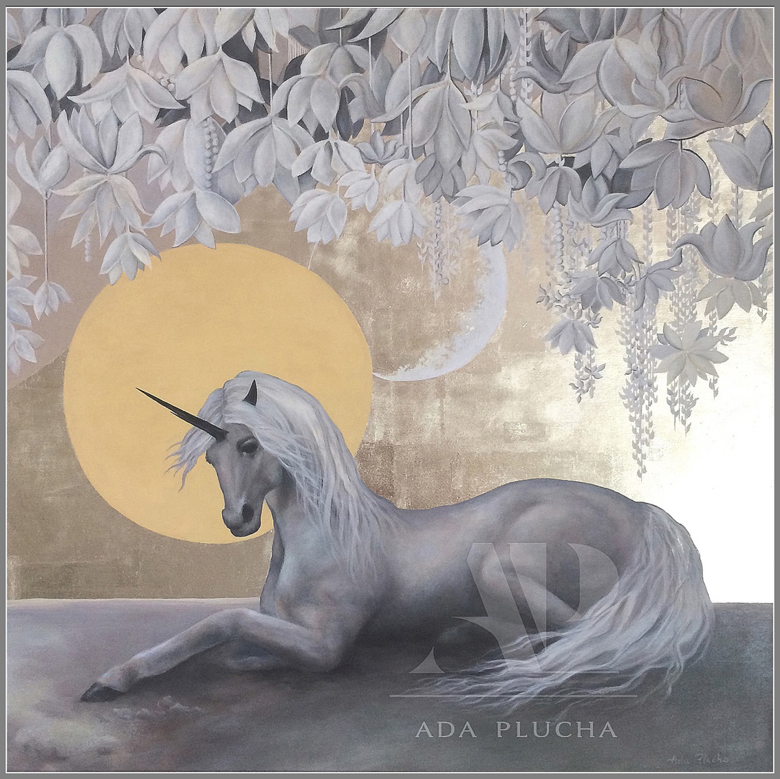 The glow on the paintings is due to a delicate layer of silver, of platinum or high carat gold applied intricately, the knowledge of which I gained in the field of art conservation. I also use gold in powder including “gold star”. A real wealth of used materials, colors of natural pigments, ornaments and details.