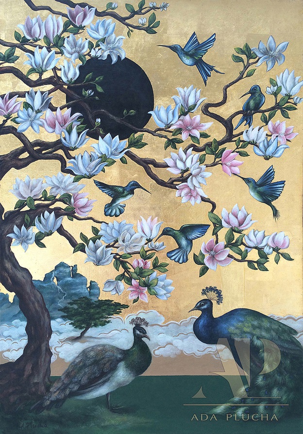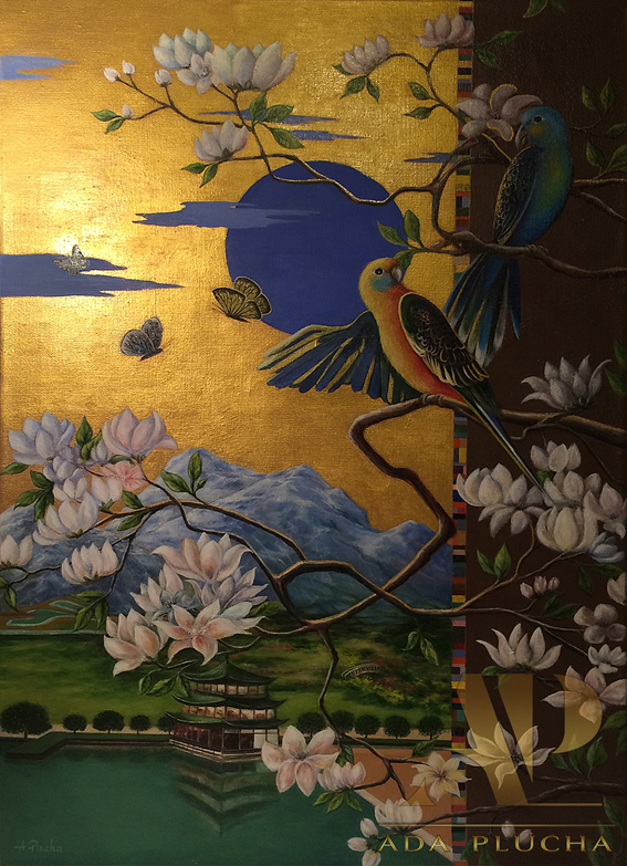Unikatowe obrazy, powstają dzięki misternie wykonanej technice naturalnej tempery jajowej. To starodawna technika malarska, która wymaga doświadczenia i znajomości warsztatu. Tempera jajowa opiera się na sproszkowanych pigmentach, głównie pochodzących z naturalnych skał, oraz na świeżym, ręcznie przygotowywanym spoiwie jajowym, której przepis owiany jest tajemnicą. Stosuję również wysokokaratowe płatki szlachetnych metali: złoto, srebro i platynę, co nadaje mojej sztuce unikatowego uroku i blasku. Z kolei częstym motywem w mojej twórczości są ptaki, a także kwiaty, przede wszystkim magnolie. Magnolie są symbolem szlachetności i godności, wytrwałości oraz miłości do natury. Oznaczają kobiecość, a także czystość oraz szczerość. Nowoczesne « złote obrazy » są nie tylko dekoracją, ale również wyrazem mojego szacunku do natury.